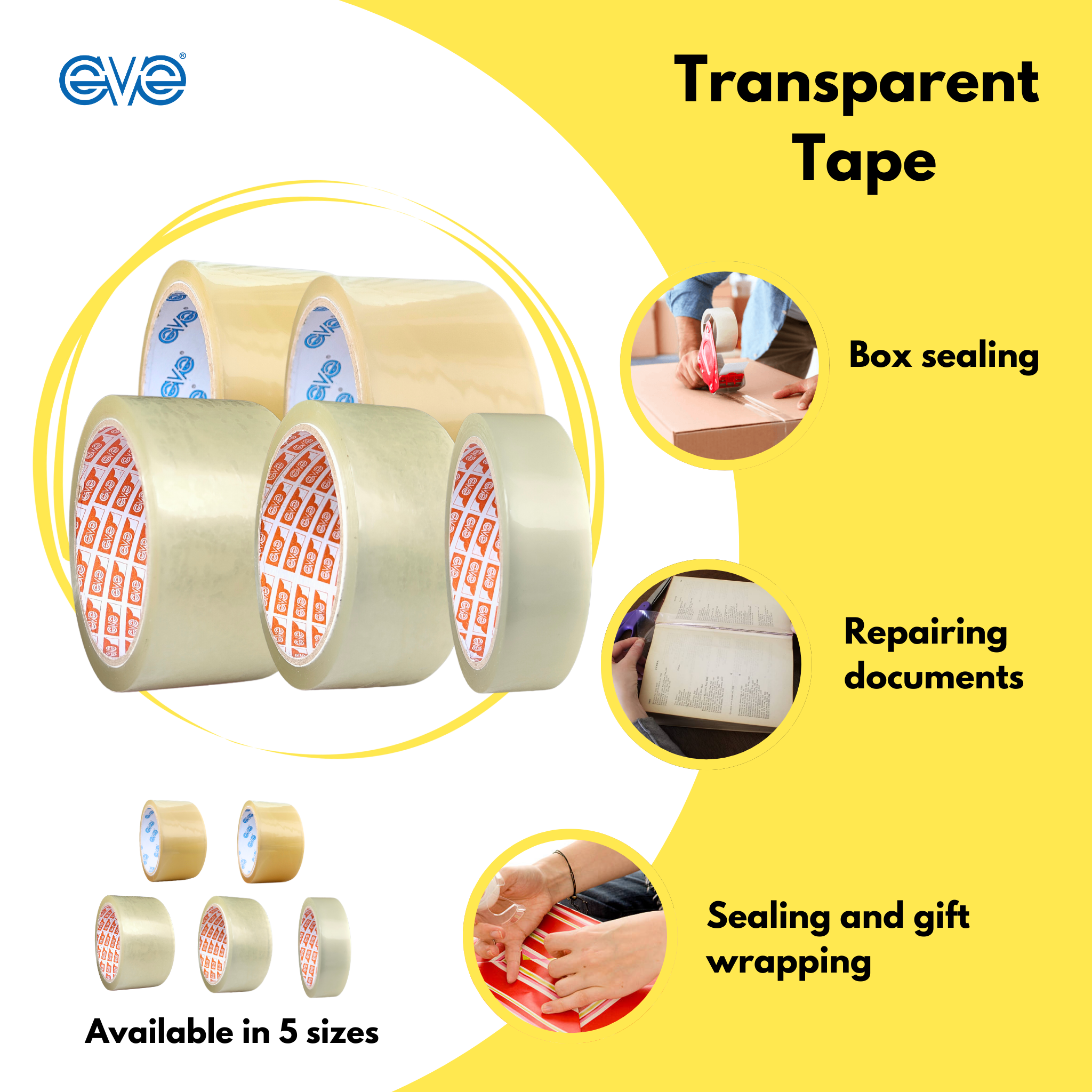 Brand: EVE Type: Opp Tape / Adhesive tape / Packing tape Size: 24mm x 50mm, 36mm x 50m, 48mm x 40m, and 48mm x 50m Colour: Clear / Transparent