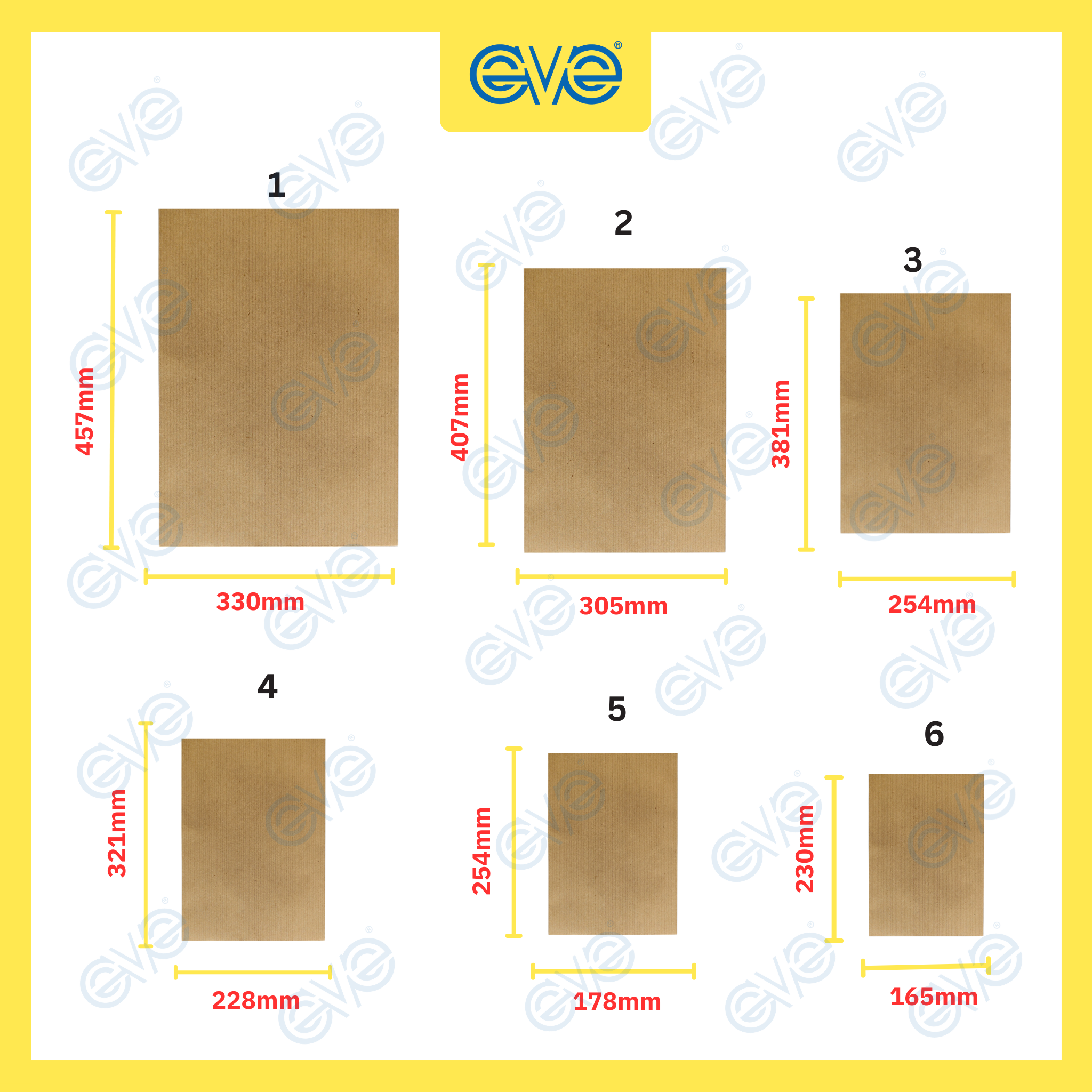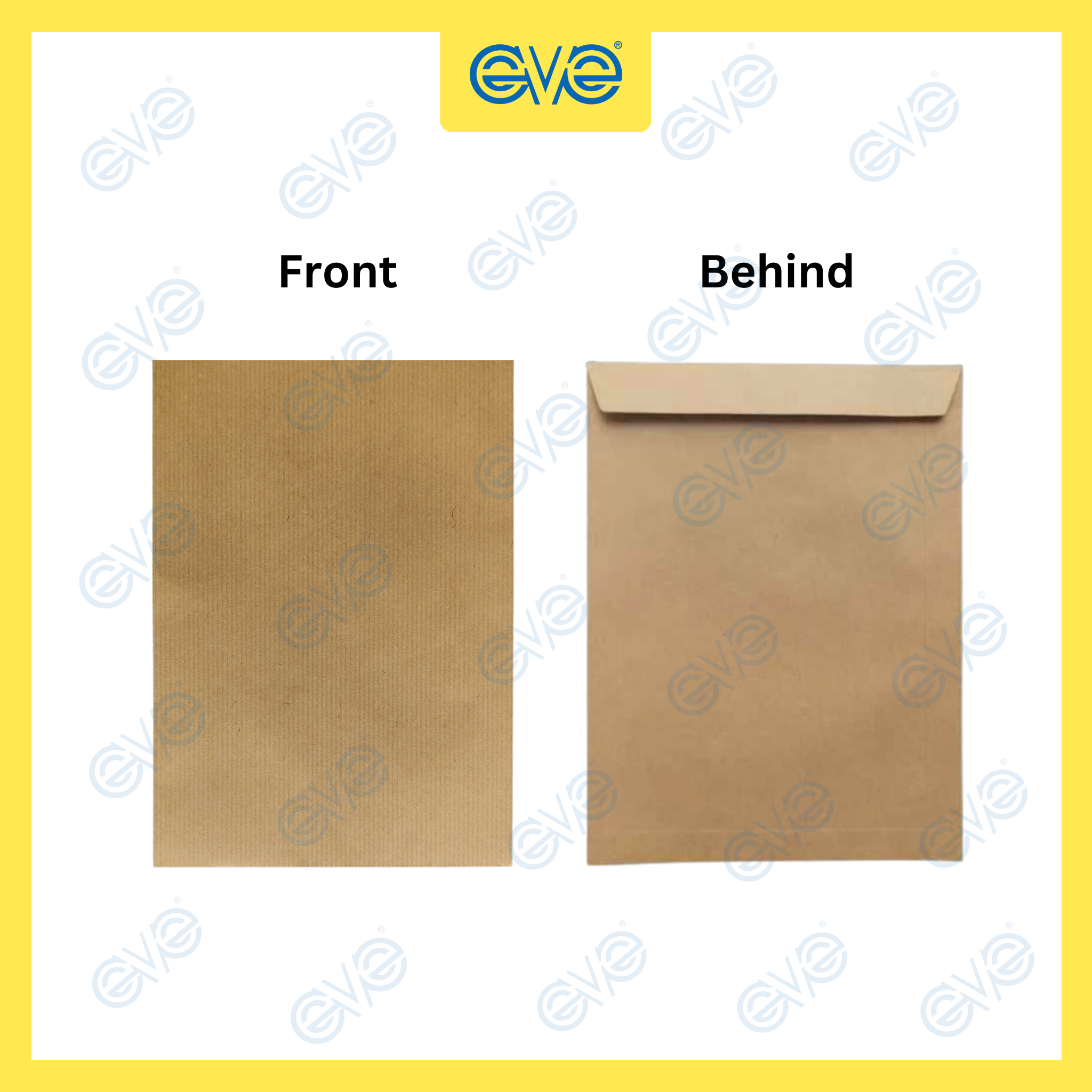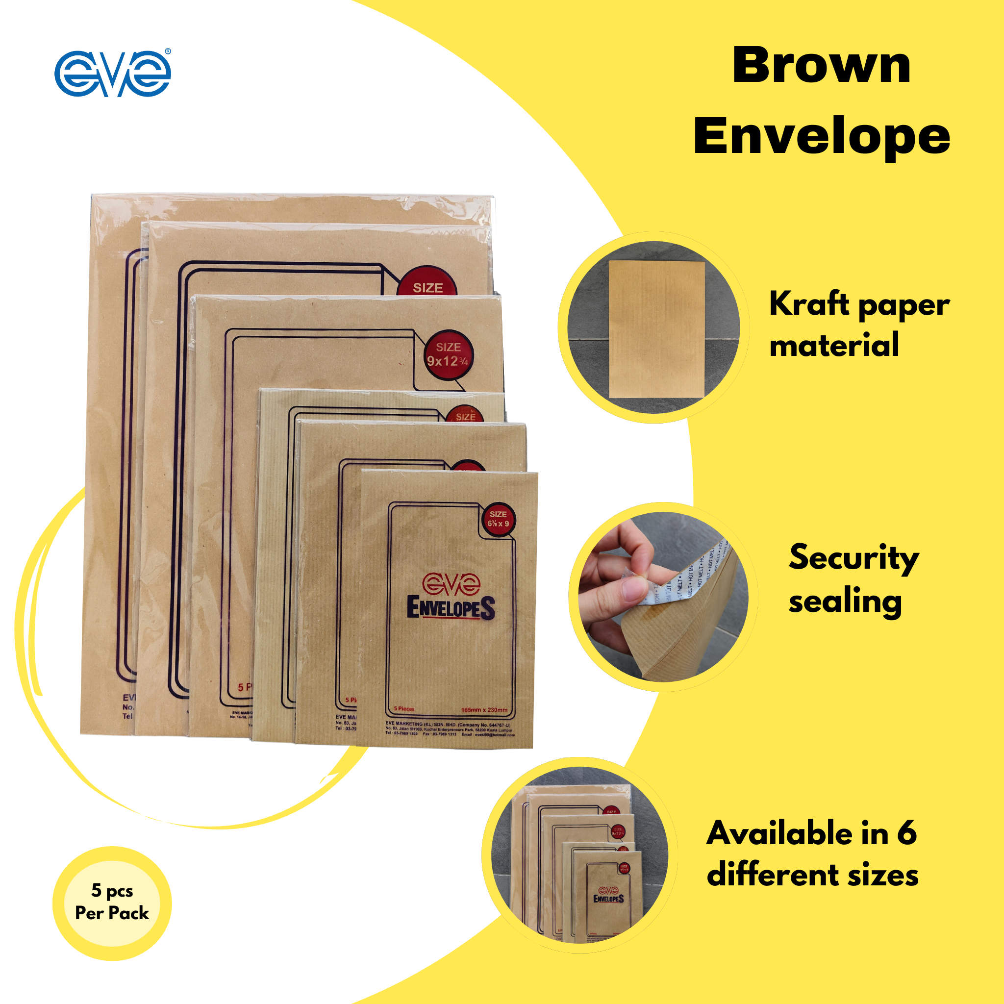 Brand: EVE Type: Brown Envelope Size: 330mm x 457mm , 305mm x 407mm , 254mm x 381mm , 228mm x 321mm , 178mm x 254mm , 165mm x 230mm Colour: Brown Piece: 5's perpack